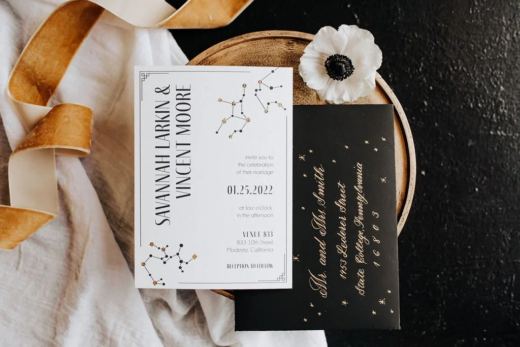 There is nothing more elegant than a roaring 20s art deco Gatsby-inspired wedding…unless you add a celestial twist to it! With the backdrop of the then brand new Venue 833 in Modesto, California, I knew I had to create something special for this shoot. With a gorgeous black and gold mood color scheme and an out of this world (pun intended!) moodboard, I set off to design stationery that would be equally as stunning.